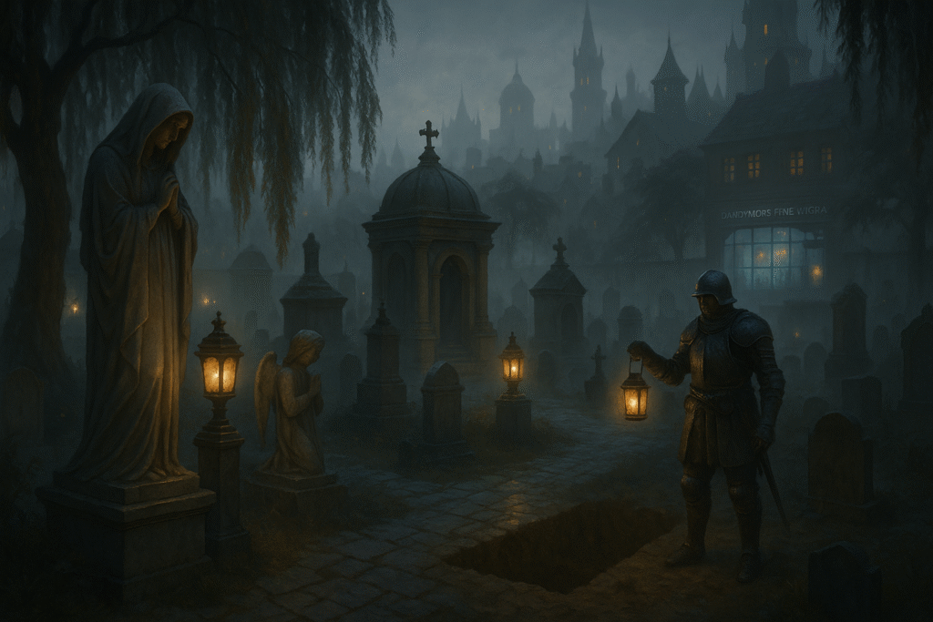 A feathered messenger, a farmer’s fury, and a trail of footprints that lead from the City of the Dead to a wig shop glowing ghost-blue in the rain. Trollskull’s heroes step from warmth into wonder, and from laughter into the cold breath of necromancy.