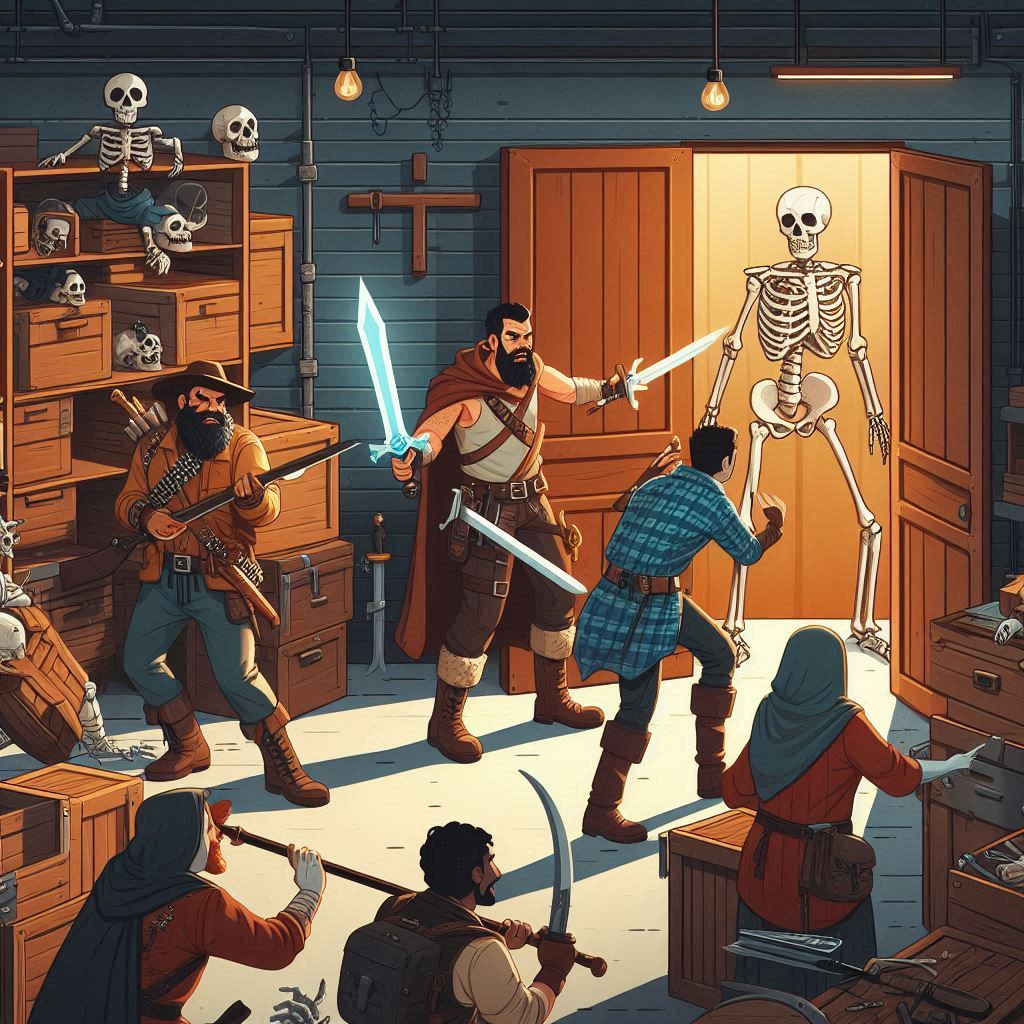 The party finds a few remaining guards hiding in a storage closet, creatively make their way through a hallway and fight off a band of animated skeletons.