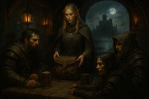 Elro’s real concern was a dwarf woman named Tugli Lutan, spotted just days ago showing similar symptoms as Urgon. She refused all help and barricaded herself in her cabin. If this sickness was spreading, it needed to be contained—and investigated. For 100 gold upfront and 250 more on resolution, Elro tasked the party with finding the source.